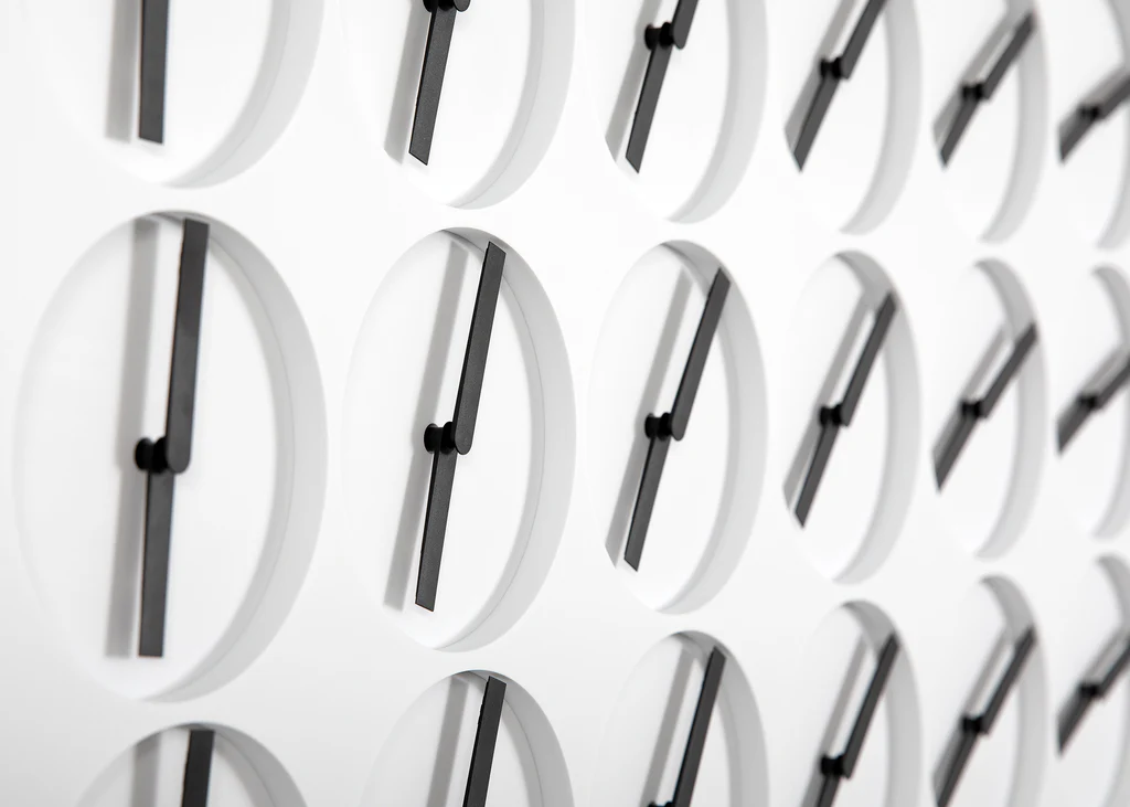 Material White mineral composite, electronic components, contrasting clock hands.